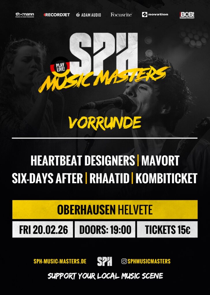 Mehr lesen Kategorie Konzert Datum 20 Feb. 2026 Uhrzeit 19:00 Genre Rock SPH MUSIC MASTERS HEARTBEAT DESIGNERS KOMBITICKET YouTube Instagram MAVORT Facebook YouTube Instagram RHAATID SIX-DAYS AFTER Teile diese Veranstaltung + Zu Google Kalender hinzufügen + iCal / Outlook exportieren 00 Tage 00 Stunden 00 Minuten 00 Sekunden